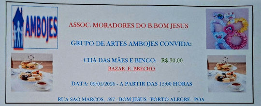 No mês de maio, vamos ter o CHÁ DAS MÃES no dia 9 de maio.